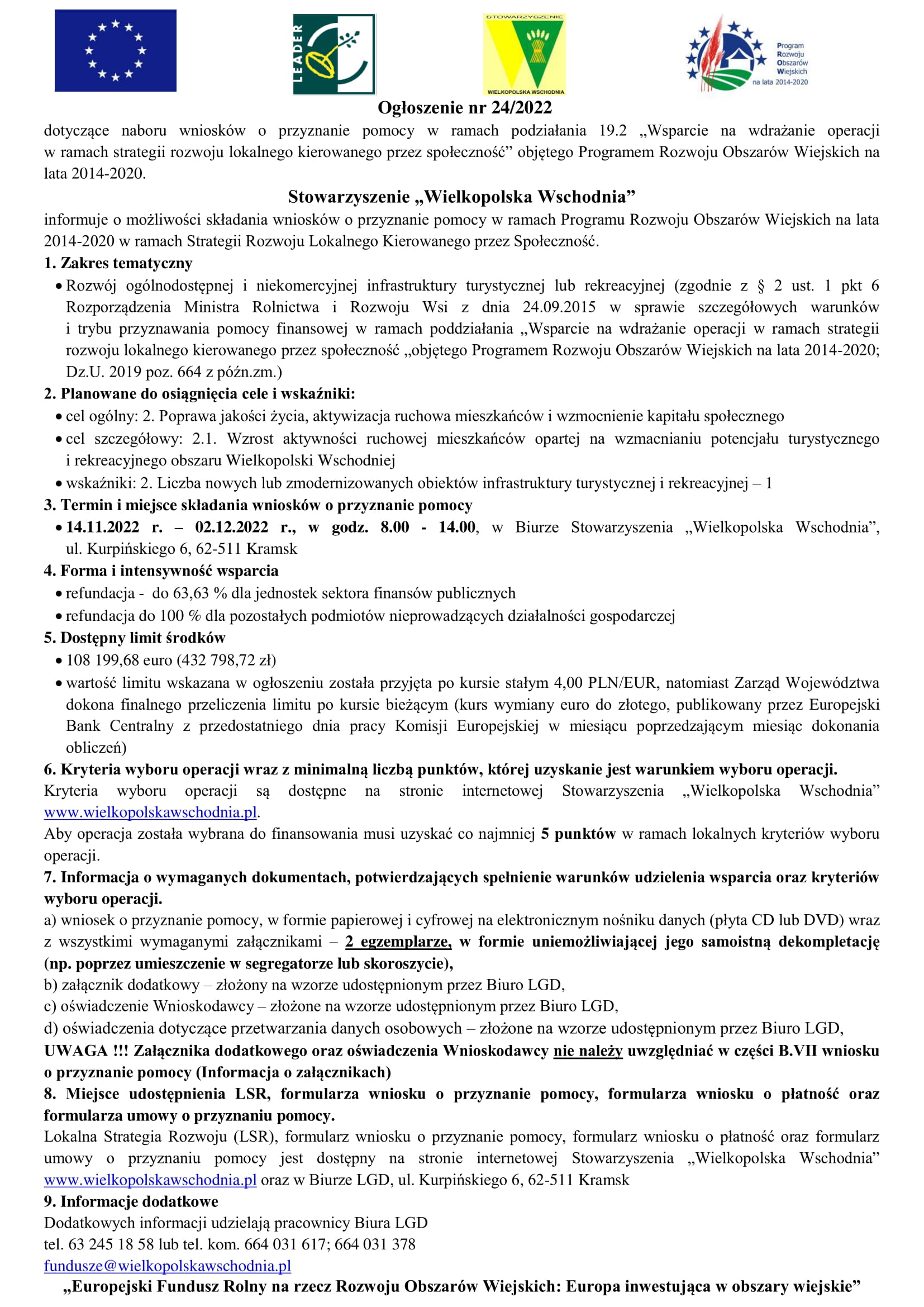 Ogłoszenia o naborach wniosków o przyznanie pomocy prowadzonych przez Stowarzyszenie "Wielkopolska Wschodnia"